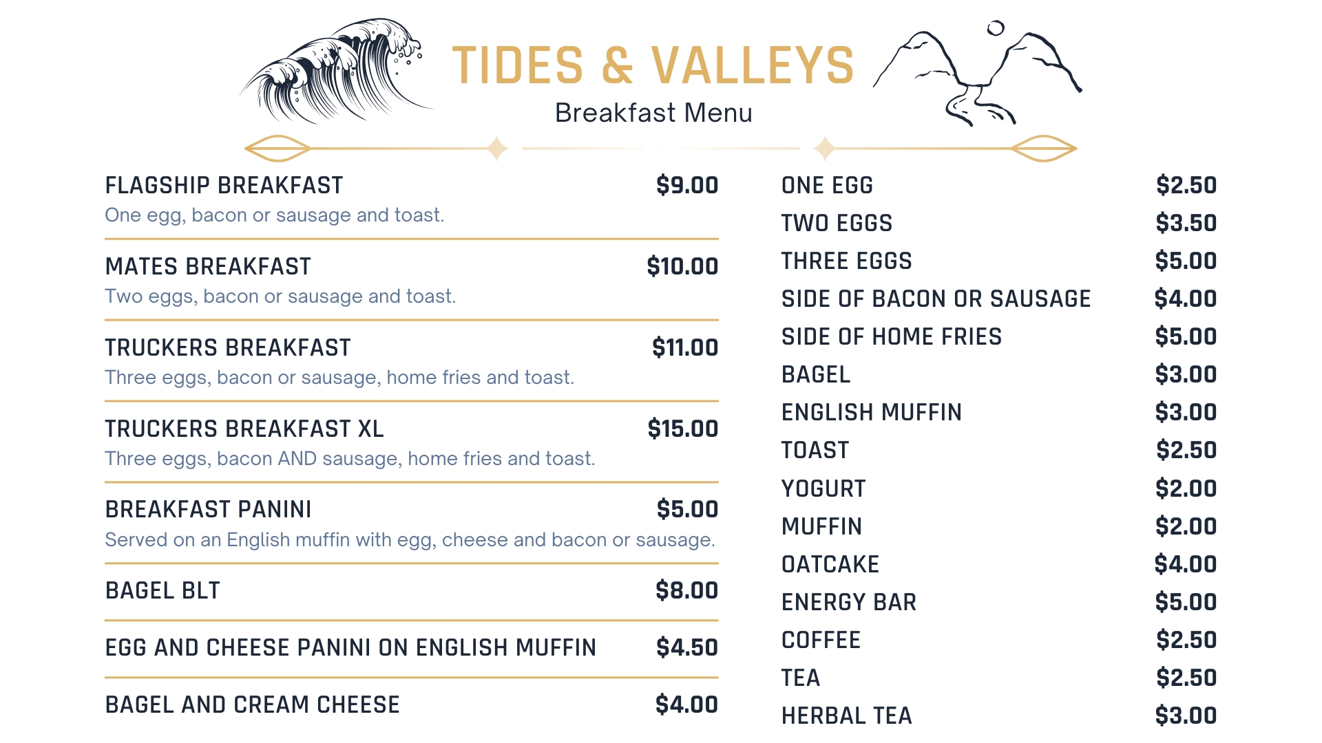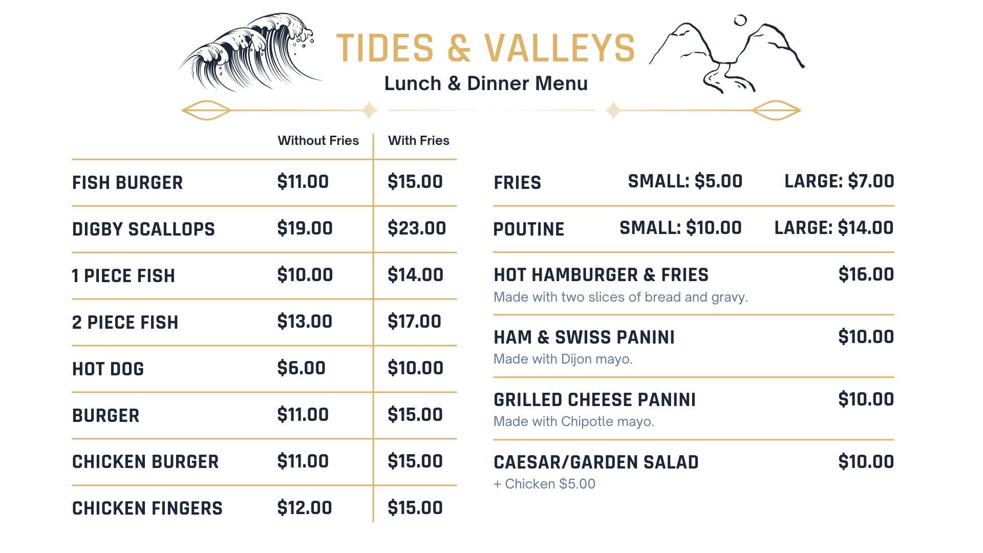 Tides & Valleys Eatery offers a full daily breakfast, lunch and dinner menu. Enjoy a variety of healthy choices such as salads, sandwiches and soups, plus items such as burgers, pizza and fresh seafood including a daily special.